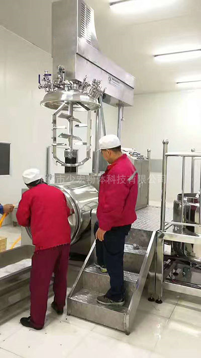 物料在水鍋、油鍋內通過加熱、攪拌進行混合反應后,由真空泵吸入乳化鍋,通過乳化鍋內上部的中心攪拌、聚四氟乙烯刮板始終迎合攪拌鍋形體,掃凈掛壁粘料,使被刮取的物料不斷產生新界面,再經過葉片的剪斷、壓縮、折疊,使其攪拌、混合而向下流往鍋體下方的均質器處,物料再通過高速旋轉的切割輪與固定的切割套之間所產生的強力的剪斷、沖擊、亂流等過程,物料在剪切縫中被切割,迅速破碎成200um-0.2um的微粒,由于乳化鍋內處于真空狀態,物料在攪拌過程中產生的氣泡被及時抽走。采用抽真空的方式,使所生產的制品在攪拌過程中不再混入氣泡,從而保證可制造出富有光澤、細膩及延展性良好的產品。